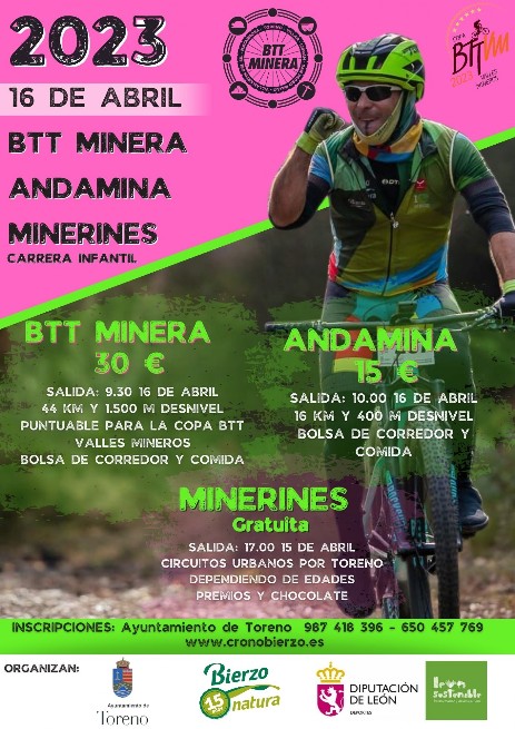En la actualidad la crisis económica ha afectado a las cuencas mineras de El Bierzo de una forma muy negativa. Con la celebración de la Marcha BTT Minera buscamos dar a conocer de una manera distinta la riqueza de nuestras minas y sus entornos. Las minas pueden convertirse en una alternativa de hacer turismo en El Bierzo, por este motivo planteamos esta prueba para conseguir que uno de nuestros principales distintivos no caiga en el olvido. Nuestro principal objetivo es que la Marcha sea reivindicativa, solidaria y un impulso turístico para los Municipios mineros. Esta V MARCHA CICLOTURISTA BTT MINERA se realizará el Domingo 16 de Abril de 2023 y la salida tendrá lugar a las 09:30. El recorrido sera alrededor de la cuenca minera Fabero-Sil. Tendrá como punto de salida y de llegada la localidad berciana de TORENO, municipio minero por excelencia.